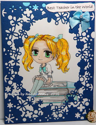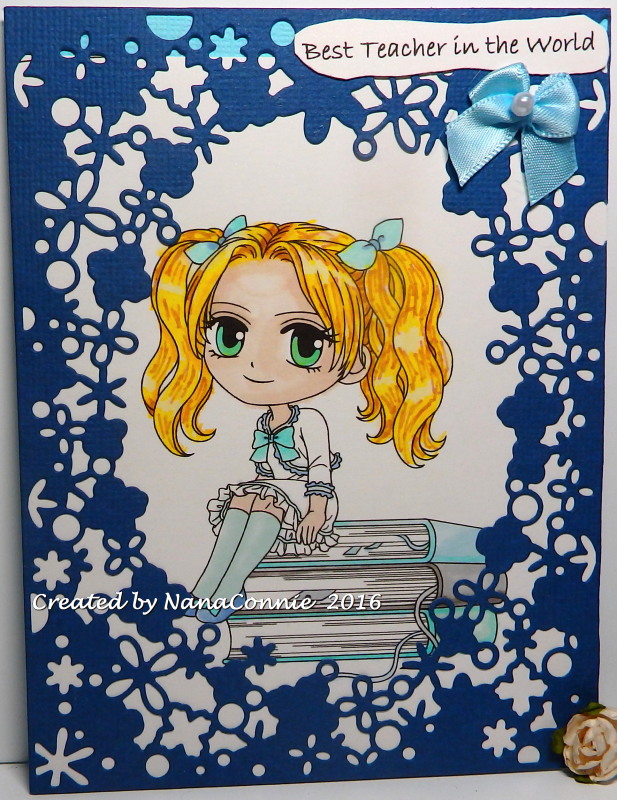 This image is from Sasayaki Glitter (CAS Challenge) and, unlike most of my coloring, this time it's done with a very tiny, liner brush and watercolors. The decorative corners are cut with a Cheery Lynn die and I added glittered flowers to the opposite corners. The sentiment is printed, hand cut, and adhered on thin foam tape. The entire image piece is mounted onto a pre-made, pink card blank.