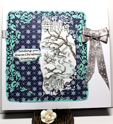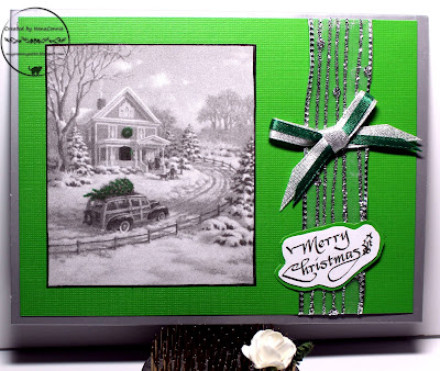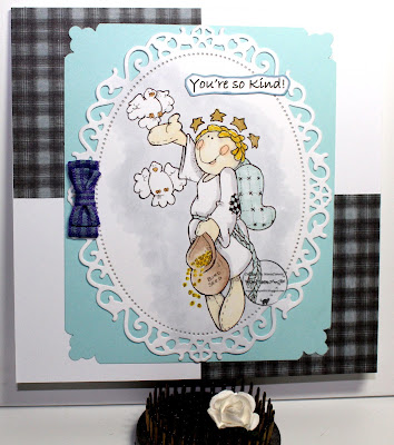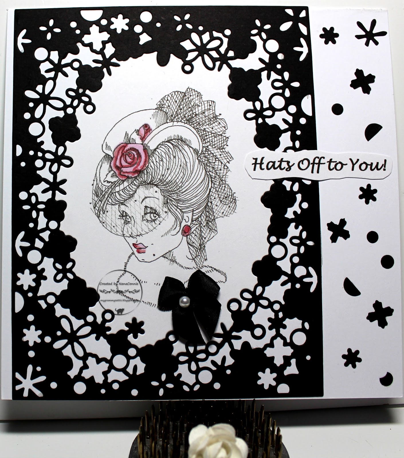 I loved the idea of just black and white with a tiny pop of a single color so I printed the image directly onto the card front, then used my ProMarkers to color only the roses, her lips, and her earring. I used one of my Memory Box dies and cut black CS with it, then laid it onto the card front, using it to surround the image with a "frame." I used a few of the negative pieces from the die cut as embellishment along the right border. Finally, I added the sentiment and a tiny, black ribbon bow with one shiny pearl.
