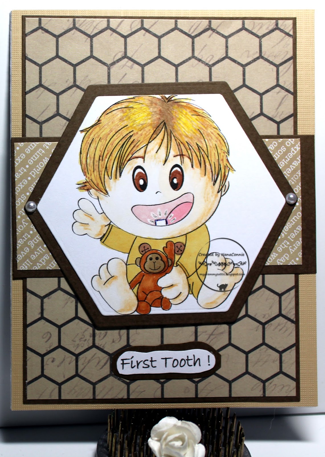 I used my ProMarkers to color the image (Bugaboo Stamps), then cut and framed it with a lattice die (Spellbinders.) The image is actually inset into the frame. The sentiment was printed and then adhered to another die cut (same Spellbinders set.)
