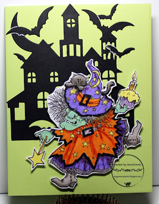 This image is from The Paper Shelter and I've had it since last year but had never used it. I thought it would be perfect for a post on Halloween itself. It's colored with ProMarkers and cut with a QuicKutz circle die. I printed the sentiment before I cut the circle.
