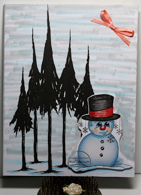I wrapped the card front with black, satin ribbon, then began layering on the sentiment and image pieces. I left the card very CAS because it will probably have to be mailed.