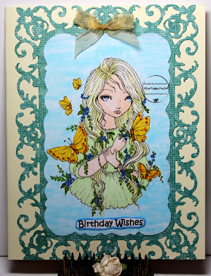 This one is colored with ProMarkers, then cut with an Unbranded die. I used another die from that same set to cut the mat. The sentiment was cut with another of my Memory Box dies.