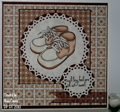 Laurie included wonderful digital papers with the "Baby Shoes" set, including the two I used which are in wonderful neutral tones. I die cut the image with a die I bought more than a year ago and haven't used recently and also die cut the sentiment (part of the Baby Shoes set) and matted them both with brown CS which has been in my stash for a good, long time. I also matted the dp with it.